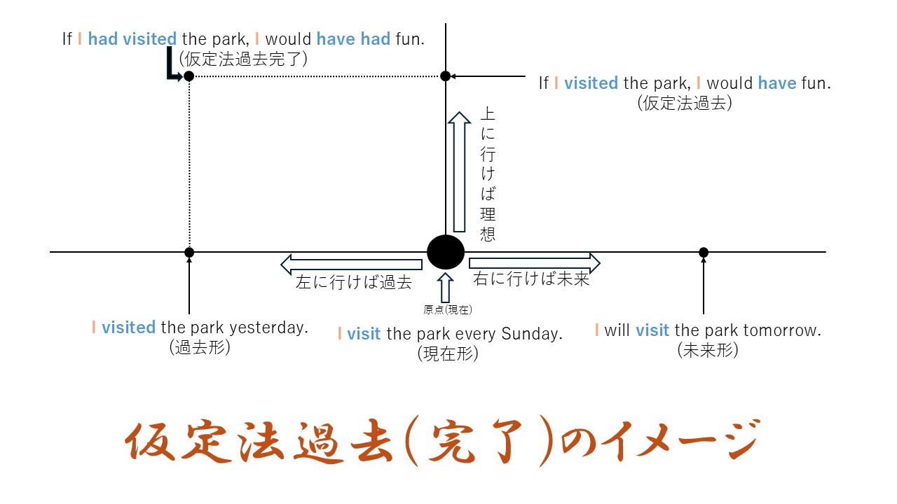 これまで左に移動していたものが上に移動し、理想と現実で距離が出来てしまうため、現在形ではなく過去形が使われるという事になります。これが「仮定法過去」ですが、形は過去形でも、あくまで「現在の事実に反する事」について言っていますので、訳は現在形と同じように訳します。